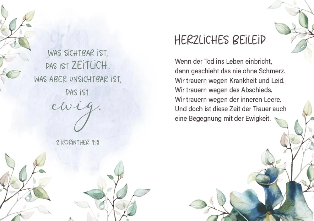 Mit dem bekannten Gedicht von Dietrich Bonhoeffer ist dieses Grussheft ein hilfreicher Begleiter durch das Tal der Trauer und eine wertvolle Unterstützung auf dem Weg des Abschieds und Neubeginns.