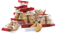 Weizengebäck mit einem Zettel im Inneren, einzeln in weihnachtlich bedruckter Zellophan-Hülle verpackt