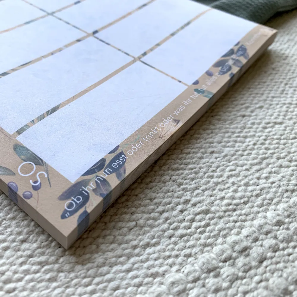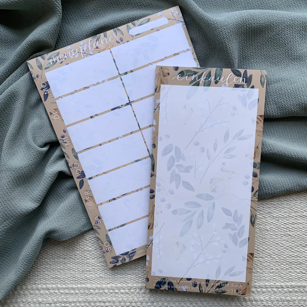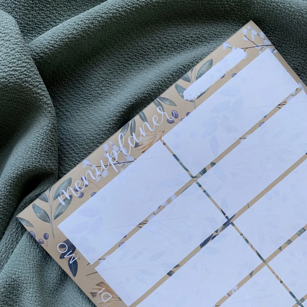 Mit diesem Menuplaner kannst du die nächsten Menus übersichtlich planen und notieren. Mit dem handgestalteten Aquarelldesign und einem passenden Bibelvers ist er ein schöner Blickfang in deinem Zuhause. Der Menuplaner ist 14.8x21cm (DIN A5) gross, beinhaltet 50 Seiten und wird durch einen Karton stabilisiert.